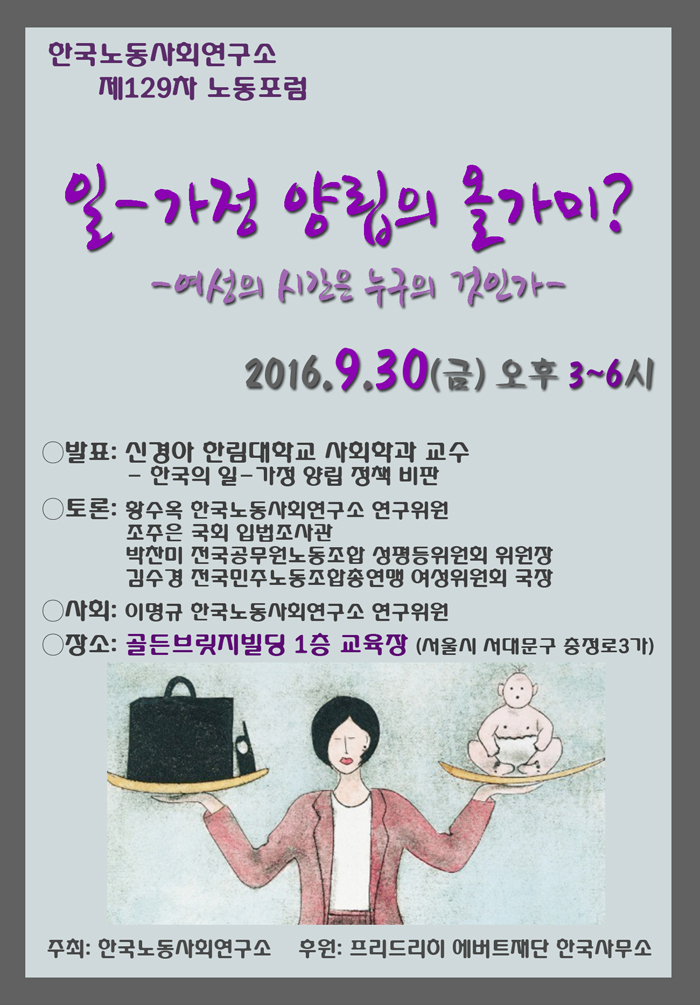 한국노동사회연구소는 오는 9월 30일 오후3시에 제129차 노동포럼 '일-가정 양립의 올가미? -여성의 시간은 누구의 것인가-'를 개최합니다.