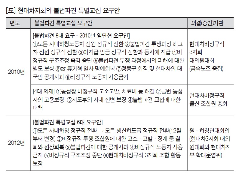 지난 9월14일 울산 공장에서 마지막으로 사내하도급 관련 잠정합의안이 나왔습니다. 합의안이 부결되긴 했지만 9.14 합의는 원청의 사용자성을 주장하며, 원청에 대해 직접 교섭 및 투쟁을 전개한 2003년부터의 초기 ‘사내하청 운동’의 한 시기를 마감한 것이라고 생각합니다. 참고로 저는 지회의 불법파견 투쟁을 사내하청 운동이라고 표현합니다. 그리고 이 합의로 인해 사내하청 운동이 원청에 직접 교섭과 사용자성을 요구하기보다는 이를 형식적으로 요구하고, 운동 자체가 제도적인 노조운동으로 변해가는 상황이 장기간 이어질 것 같습니다. 아울러 이번 현대차 합의를 끝으로 사내하청 노조의 존립 방식은 현대제철 비정규직지회나 희망연대노조처럼 일정 정도의 조직 구조를 통해 사내하청 노사 간의 안정적인 협의 구조와 제도화된 틀을 만들어 가는 식으로 변화할 것이라고 예상해봅니다. 즉 원청을 상대로 한 사내하청 노동자들의 격한 투쟁, 원청 노조와의 대립적인 투쟁의 한 시대가 일정 정도 마감했다는 것입니다.