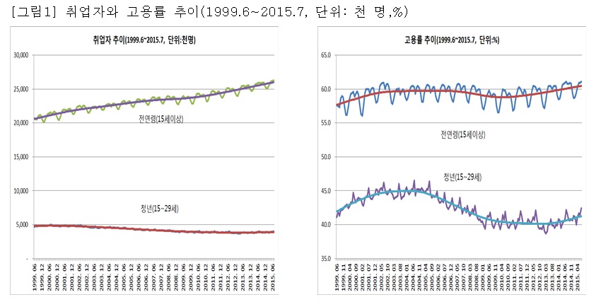 o 청년(15~29세) 취업자는 2000년 488만 명에서 2013년 379만 명까지 꾸준히 감소하다가 2014년(387만 명)에 처음 증가했다. 청년 고용률은 2002년 45.1%에서 2013년 39.7%까지 꾸준히 감소하다가 2014년(40.7%)에 미약하게나마 증가세로 돌아섰다([그림1] 참조).