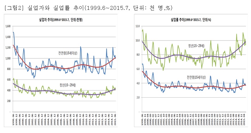 o 청년(15~29세) 실업자는 2000년 43만 명(8.1%)에서 2002년 36만 명(7.0%)으로 감소한 뒤 30만 명(7%) 대에서 오르내렸다. 최근에는 2013년 33만 명(8.0%)에서 2014년 39만 명(9.0%), 2015년 상반기 44만 명(10.1%)으로 가파르게 증가하고 있다([그림2] 참조).