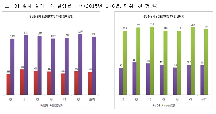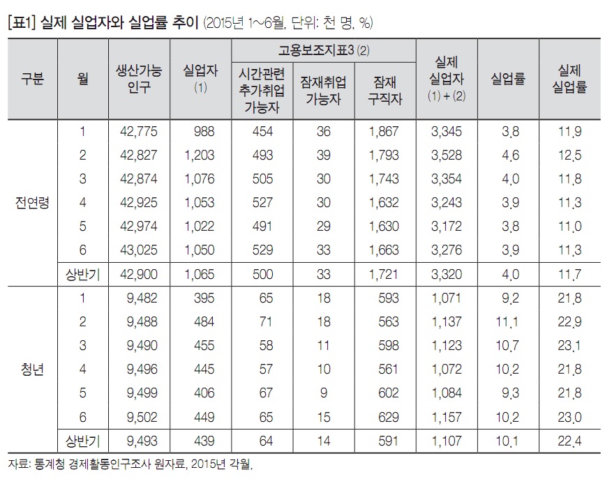 o 2015년 상반기 청년 실업자는 44만 명이고, 잠재구직자는 59만 명, 시간관련 추가취업가능자는 6만 명, 잠재취업가능자는 1만 명이며, 청년층에서 실제 실업자(실업률)는 111만 명(22.4%)이다. 공식 실업자의 41.1%, 실제 실업자의 33.4%가 청년이다([그림3]과 [표1] 참조).