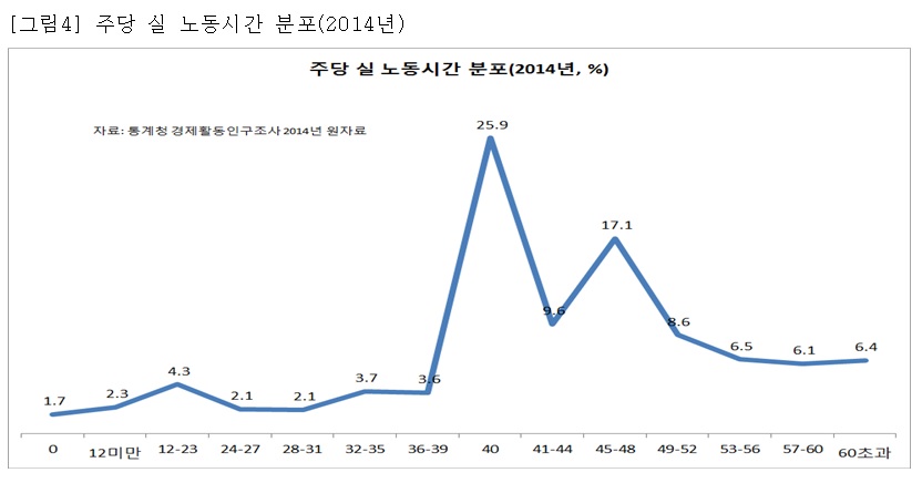 o 2014년 주당 노동시간이 36시간 미만인 단시간 노동자는 304만 명(16.3%)이고, 36시간 이상 52시간 이하인 노동자는 1,214만 명(64.7%)이며, 법정 초과근로한도인 주52시간을 초과해서 탈법적으로 장시간 노동을 하는 노동자는 357만 명(19.0%)이다([그림4] 참조).