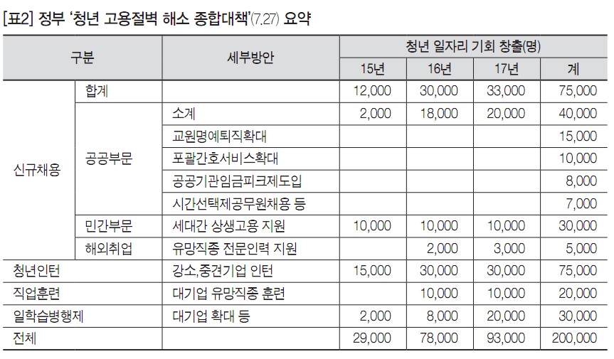 o 정부는 2015년 7월27일 관계부처 합동으로 “청년에게 내일을, 미래세대에게 희망을”이라는 구호 아래 ‘청년 고용절벽 해소 종합대책’을 발표했다. 핵심은 ‘2015년부터 2017년까지 3년 동안 20만 개 이상의 일자리 기회를 만들겠다’는 것인데, 신규채용은 7만 5천 명밖에 안 되고 나머지 12만 5천 명이 인턴과 직업훈련이다.