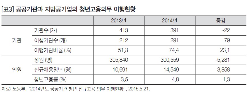 o 노동부에 따르면 청년고용의무조항을 적용하기 시작한 2014년에 공공기관과 지방공기업의 청년고용의무 이행률이 크게 개선되었다. 청년고용의무 이행기관 비율은 2013년 51.3%에서 2014년 74.4%로 23.1%p 높아지고, 청년 고용률도 3.5%에서 4.8%로 1.3%p 높아졌다([표3] 참조).