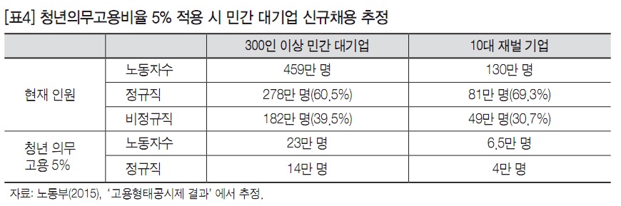 o 청년의무고용비율 5%를 300인 이상 민간 대기업에 적용하면 청년 일자리가 23만개 늘어나고, 10대 재벌기업에서는 6만 5천개가 늘어난다. 정규직으로 한정하더라도 300인 이상 민간 대기업은 14만개, 10대 재벌 기업은 4만개의 일자리가 늘어난다([표4] 참조).