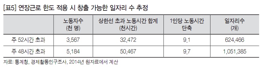 - 2014년 현재 주48시간을 초과하여 장시간 노동을 하는 사람은 모두 518만 명이며, 주48시간을 초과하는 노동시간을 모두 합치면 5,047만 시간이다. 이를 주48시간으로 나누면 새로운 일자리 105만개가 가능하다([표5] 참조).