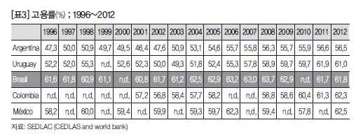 [표2]를 보면 실질 최저임금 증가를 볼 수 있는데요. 1996년부터 나와 있는데 2000년대를 100이라고 하면, 이후 엄청나게 최저임금이 증가했는데, 브라질 상황에서는 큰 변화입니다. 브라질 인구의 절반 이상이 최저임금 수준에 의존해서 생활하고 있기 때문에, 최저임금의 인상은 브라질 인구 절반의 소득 증대로 이어지고 이것이 수요의 증대로 이어졌습니다.