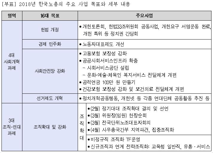 2018년 한국노총은 “참여와 견제”에 중심을 두고, “협상과 연대, 투쟁의 3조화”로 활동기조를 세워 2대 핵심 사업을 추진하고 있다. 2대 핵심 사업은 ‘노동 존중 사회 실현’과 ‘100만 노총 조직 강화와 200만 조직화’이다. 먼저, 노동 존중 사회 실현을 위하여 정부의 국정과제 및 한국노총과 맺은 정책연대협약 12대 과제가 올곧이 이행되기 위해서는 정부 정책에 적극 개입하여 노총과 당정 간 정책협의체 본격화, 노사정 3자 간 사회적 대화체제 재구축과 사회적 대화 등을 전개해 나간다는 방침이다. 또한, 노동사회 개혁과제의 관철을 위하여 연대와 협상과 투쟁을 전개한다. 최저임금 인상, 사회안전망 확보 등 노동사회 의제는 사회적 연대를 통해서 범(汎)노동 시민사회 진영이 지속적으로 여론화, 공론화시켜 나아가며, 대국회, 대정부 협상과 투쟁을 통해 제도개선을 달성해 나갈 계획이다.