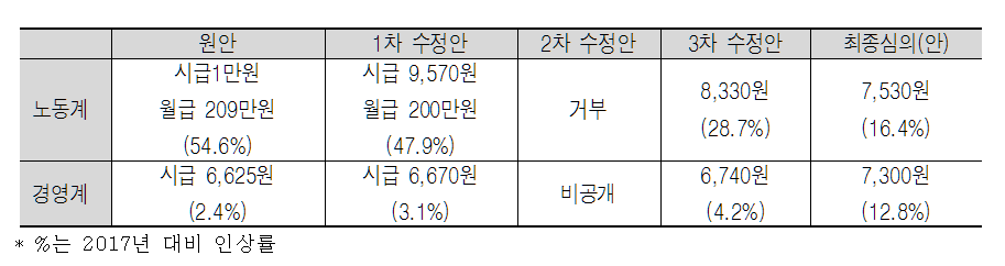 2017년 최저임금 심의결정과정은 최근 관례와는 다르게 진행되었다. 관례에 따르면 공익위원이 노․사측에 수정안 제출을 요구하고 간극을 줄이는 과정을 거치면서 합의를 도출하거나 또는 합의 도출이 불가능하다고 판단되면 공익위원이 단일안을 제출하고 찬반 표결하는 방식으로 진행되었다. 그러나 2017년 진행방식은 노사 측에서 각각 제출하는 최종심의안을 투표를 통해 결정하는 방식으로 진행하였다. 공익위원이 심의촉진구간을 비공개(노동계에는 최고구간만 공개, 경영계엔 최저구간만 공개)로 제시하여 ‘최고구간–최저구간’범위 안에서 심의안을 노사 측이 각각 제출하여 투표를 통해 결정하는 방식으로 바뀌면서 노사 측 모두는 과거와 같은 퇴장전술을 사용하지 못했다.