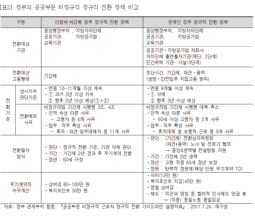 첫째, 정규직 전환의 5가지 기본원칙은 ‘상시·지속업무’가 핵심 기준이다. 정규직 전환의 상시지속 업무 기간(기간: 9개월, 지속성: 향후 2년) 기준은 이전과 달리 과거 2년의 기간을 삭제했다. 정규직 전환 대상도 간접고용과 초단시간 비정규직이 포함되었다. 새로 추가된 전환 대상업무는 공공부문 비정규직의 80%가 넘는 규모다. 이 업무의 대다수는 저임금 고령의 취약층이다. 따라서 간접고용 비정규직의 정규직화는 노동시장에서 불안정한 저임금 취약 노동자 해결과도 연결된다.