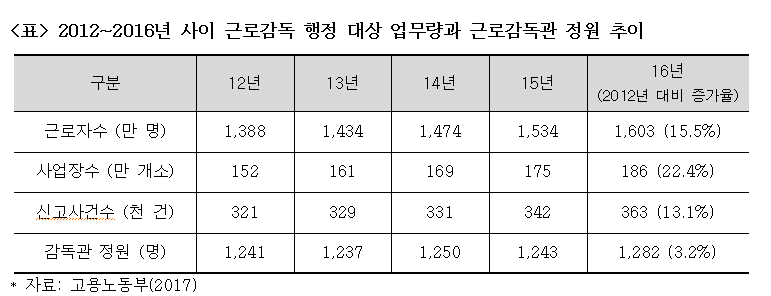 지난 5월 출범한 문재인 정부는 이전 정부와 달리, 공공부문의 일자리를 적극적으로 늘리겠다는 방침을 천명했고 임기 내 근로감독관 1,000명을 더 늘리겠다는 방침 아래, 금년도 추가경정예산에 500명 근로감독관 증원을 위한 예산을 요청했다. 하지만 중앙공무원 증원에 부정적인 야당의 반대로 관련 예산은 대폭 삭감되었고 근로감독관은 200명 증원하는 것으로 결론이 났다. 정부가 노동존중 사회의 실현을 위해 근로감독관 업무가 매우 중요하다는 것을 인식하고, 인원을 대폭 충원하기 위한 시도는 높이 평가할 만하다. 그러나 국회 추경예산안 처리절차를 거치면서 당초 충원 계획 대비 40%만 반영된 점은 아쉽다.