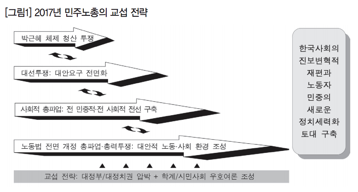 박근혜·재벌체제의 온전한 청산, 비정규직 철폐와 좋은 일자리로의 전환 및 창출, 모든 노동자의 노조할 권리 보장, 사회공공성·사회안전망 대폭 확충, 민주주의·평화사회 건설을 위한 대전환은 이미 시작되었다. 촛불투쟁으로 들어설 새 정부가 촛불민심을 배신하지 않고, 노동과 평등이라는 시대의 화두를 올곧게 실현하기를 바란다. 그렇지 않을 경우, 우리를 기다리고 있는 것은 그 누구도 원치 않는 ‘불만의 겨울’이 될 수밖에 없을 것이다.