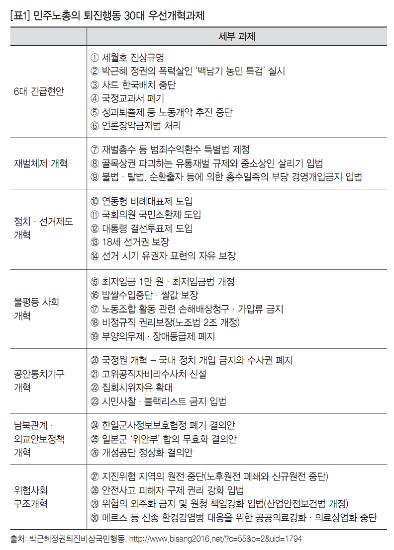 박근혜 퇴진 촛불투쟁은 소위 박근혜-최순실-재벌 게이트로 촉발된 상층권력의 부당한 행태, 비정상적인 헌정 질서에 대한 반발과 분노로 촉발되었다. 그러나 근원에는 지난 수 십 년에 걸친 시민들의 사회·경제·정치적 박탈과 배제, 재벌 독식구조에 따른 경제적 이익의 소수 집중, 노동자·서민의 생존권 위협 등에 대한 광범위한 불만이 자리 잡고 있다.