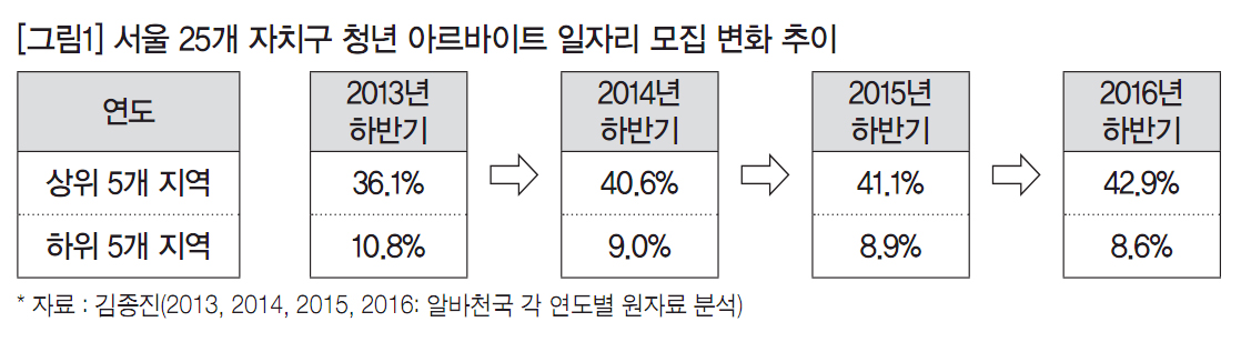 최근 몇 년 사이 서울시 25개 자치구별 일자리 상위 5개 모집 지역의 비중은 2013년 36.1%에서 2016년 42.9%로 6.8%p 증가했다. 아르바이트 다수 모집지역은 강남구, 서초구, 송파구, 중구, 마포구, 영등포구, 종로구 등 7개 지역이다. 반면에 일자리 하위 5개 모집 지역 비중은 2013년 10.8%에서 2016년 8.6%로 2.2%p 감소했다. 아르바이트 소수 모집지역은 도봉구, 강북구, 중랑구, 은평구, 금천구 등 5개 지역이다.