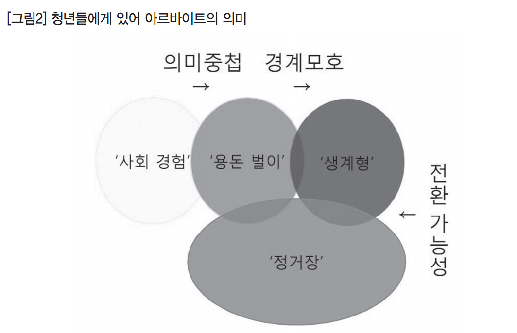 청년들에게 ‘아르바이트’란 의미가 중첩되고, 경계가 모호한 일자리였다. 이들에게 아르바이트의 의미는 △용돈벌이(여행비, 유흥비, 식대 등), △생계형(1인 가구 생계비, 가족 부양·보조, 학비 등), △‘정거장’(정규 노동시장 진입 및 진학 전 ‘잠시 거쳐 가는’ 일), △‘사회경험’ 또는 ‘자기개발’(전공이나 흥미 분야 등) 등으로 다양했다. 또한 아르바이트 의미는 단일하지 않고 서로 중첩되는데, 현재 청년들의 아르바이트 선택 기준은 특별한 사유가 있는 것이 아니면 ‘시급’과 ‘시간대’였다.