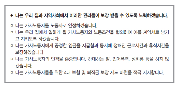 국내에서는 전국가정관리사협회가 국내 상황에 맞게 내용을 정리하여 ‘공정한 일터, 당신의 집과 사회에서 가사노동자의 권리를 지켜주세요!’라는 내용이 적힌 ‘서명엽서’를 통해 가사서비스 이용자와 일반인을 대상으로 캠페인을 진행하고 있다. 그 내용은 다음과 같다.