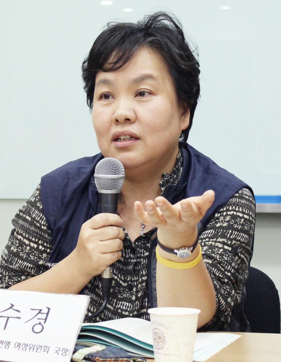 최근 박근혜 정부가 일‧가정 양립 지원정책을 많이 내놓았습니다. 그러면 해당 정책에 대해 논평해 달라는 전화문의가 오는데, 정책의 실효성이 너무 떨어지는 탓에 좋고 나쁨을 이야기할 것도 없이 화가 날 정도입니다. 육아휴직의 경우 민주노총 사업장 대부분에서 보장되고 있으나, 공무원 및 교사를 제외하고는 경력 유지와 승진 등에 있어 불이익을 감수해야 하기 때문에 실제 사용률은 낮습니다. 특히 사무‧금융권의 사용률이 매우 낮습니다. 최근 금융권의 대규모 구조조정 과정에서 육아휴직 중인 여성들을 구조조정 대상 1순위로 삼았습니다. 구조조정의 취지대로라면 높은 직급의 고임금 남성을 자르는 것이 맞는데, 낮은 직급의 여성을 대상으로 삼은 거죠. 금융권에서 구조조정이 항시적으로 이루어지고 있기 때문에 여성들은 더 이상 육아휴직을 기대할 수 없게 되었습니다.