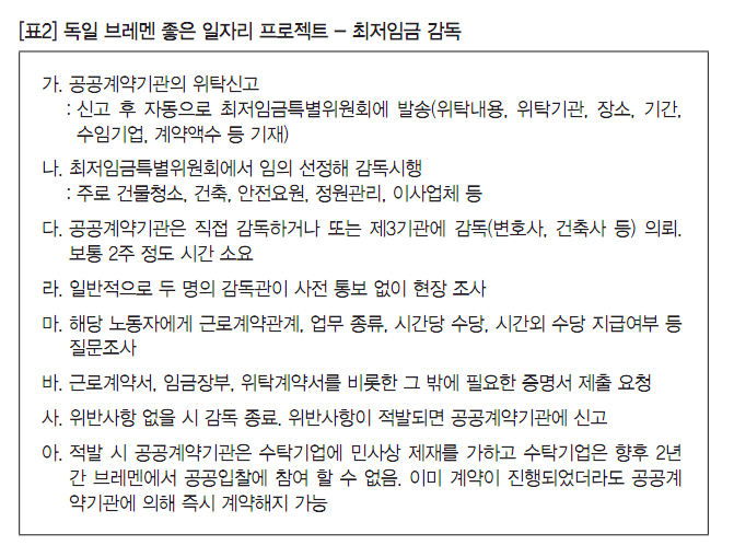 인구 54만 명의 브레멘은 단순 일자리 창출을 넘어 좋은 일자리 창출이 목표가 되어야 한다는 의미에서 공공부문의 ‘최저임금 감독’과 ‘공공조달의 사회적 책임을 고려한 규제 방식’을 적극 시행하고 있다. 특히 브레멘의 최저임금 감독은 공공계약기관 위탁업체의 계약서류, 업무 종류, 근로시간, 임금지급 등의 제반 노동조건을 모니터링하고, 법령 미준수 시 계약해지까지 가능하도록 하고 있다. 특히 최저임금 위반을 점검하기 위해 사전 예고통지 없이 현장조사를 하거나, 현장 노동자의 질문조사 등도 병행한다. 브레멘은 최저임금 위반 적발 시 향후 2년간 지자체 공공입찰에 참여하지 못하도록 하는 등 규제 정도가 매우 강력하다([표2]).