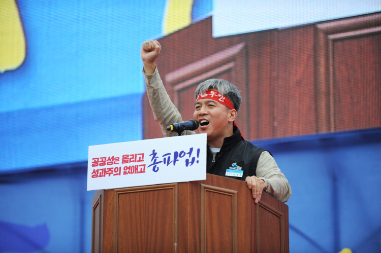 (김영훈 철도노조 위원장이 9월29일 여의도 광장에서 열린 노조 결의대회에서 발언하고 있다. ⓒ철도노조)