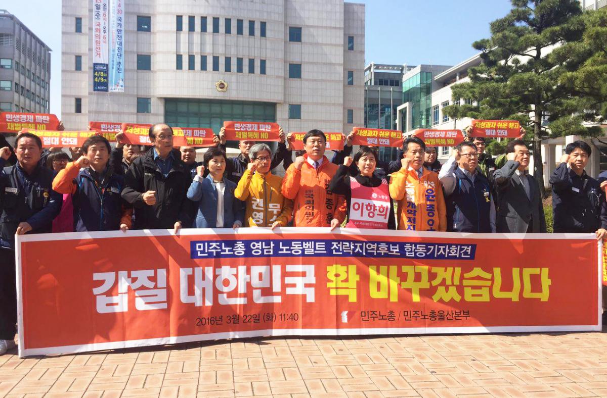 (2016년 3월22일 윤종오 후보가 민주노총 영남 노동벨트 전략지역후보 합동기자회견에서 구호를 외치고 있다. ⓒ윤종오 후보 선거대책본부)