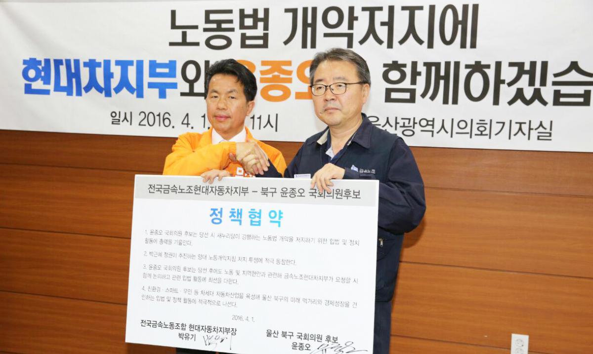 (2016년 4월1일 현대차지부와 윤종오 후보가 정책협약을 맺고 있다. ⓒ윤종오 후보 선거대책본부)