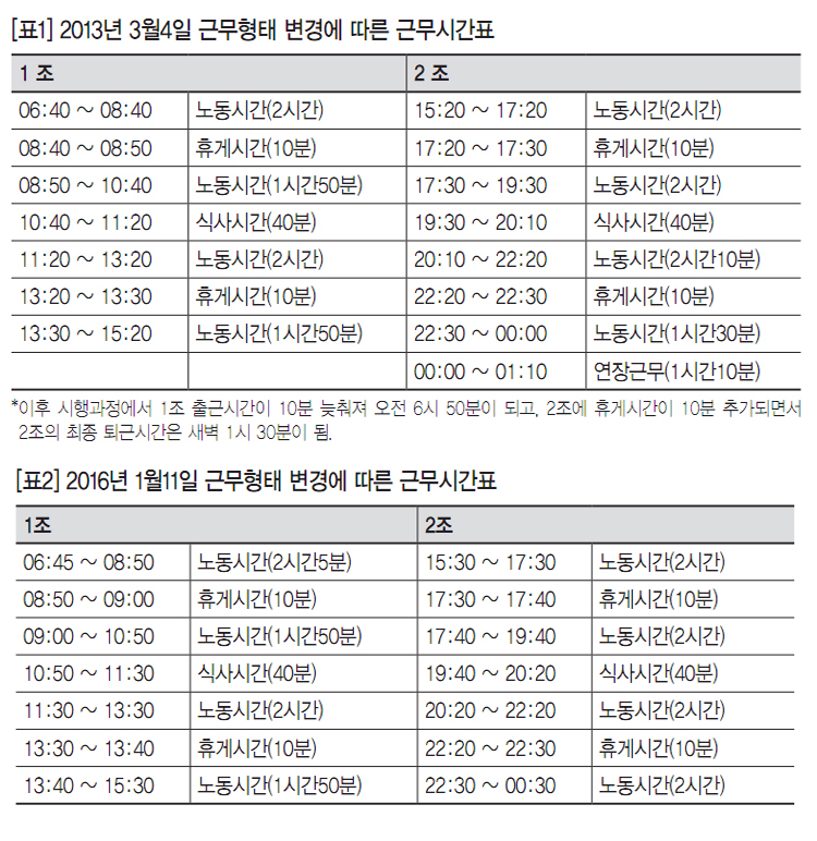2013년 3월4일. 현대자동차의 근무형태가 ‘8/8+1시간’의 주간연속 2교대제로 변경되었다.  이어 2016년 1월11일 ‘8.08/8.33시간’으로 다시 한 번 근무시간이 단축되었다. 시간으로 따지면 55분의 노동시간이 단축된 것이다.