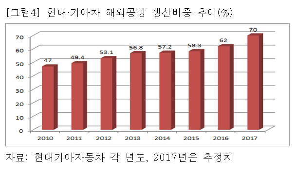 현대·기아자동차의 해외생산 비중도 계속 증가하여 2010년 47%이던 해외생산 비중은 2016년에는 60% 이상이 되고 2018년에는 70%에 도달할 예정이다([그림4] 참고).
