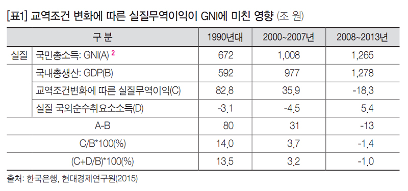 한국의 세계 시장 경쟁력에서 주요한 부분은 환율조정과 단가인하 효과였다. 그러나 40년 간 지속해 온 수출단가 인하 및 고환율 정책으로 인하여 교역조건이 악화되어 왔고, 2008년 임계치를 넘으면서 최근 6년간 실질무역손실이 발생하고 있다. 그 결과 국민의 구매력이 저하되어 국민총소득(GNI)이 국내총생산(GDP)에 미치지 못하고 있다. [표1]을 보면 2000~07년 사이 실질GNI가 실질GDP보다 높았으나 2008~13년 사이에는 역전되었다. 이는 경제성장만큼 국민소득 증가가 이루어지지 못했다는 의미이다. 2008~13년에 실질 국외순수취요소소득(D)은 5.4조 원 흑자로 전환하였으나 실질무역손실(C)이 -18.3조 원 적자를 기록하여 실질GNI는 감소하였다. 실질GNI가 실질GDP를 하회하기 시작한 2008부터 2013년까지 교역조건 변화를 반영한 실질무역 손실액은 연 평균 18.3조 원이다.