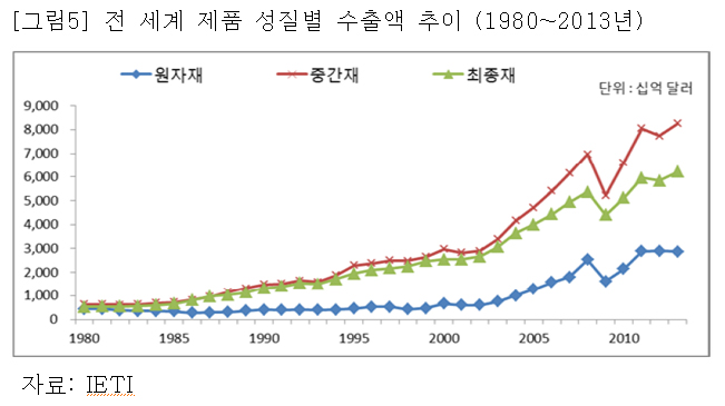[그림5]에 의하면 2013년 전 세계 제품 수출액(17조 3천억 달러) 중에서 중간재 수출비중은 48%, 최종재는 36%, 원자재는 17%를 차지한다. 중간재 제품의 수출이 갈수록 중요해지고 있음을 알 수 있다.