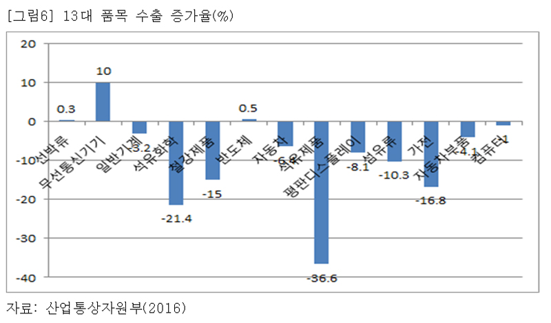 수출 비중의 80%를 차지하고 있는 13대 품목 현황을 보면 [그림6]과 같다. 주력산업 중 2015년 수출이 증가한 품목은 무선통신기기와 반도체뿐이다.