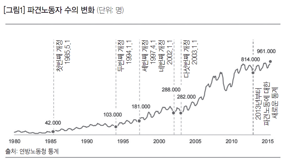 독일의 파견분야는 긴 시간 동안 매우 가파르게 성장하였다. 2008~2009년 경제위기 시기에 짧은 기간 동안 성장이 멈추거나 하락하는 시기가 있었지만, [그림1]에서 보듯이 성장의 배경에는 특히 주요한 법률상 변화가 맞물려 있다. 1993년 파견노동자 수는 연평균 11만 4천 명이었지만 5년 후 그 숫자는 두 배로 늘어났다. 특히 하르츠 개혁에 따른 법률의 변화로 파견 분야가 엄청나게 확장되었다. 2015년 6월 기준으로 독일의 파견노동자 수는 96만 1천 명이다.