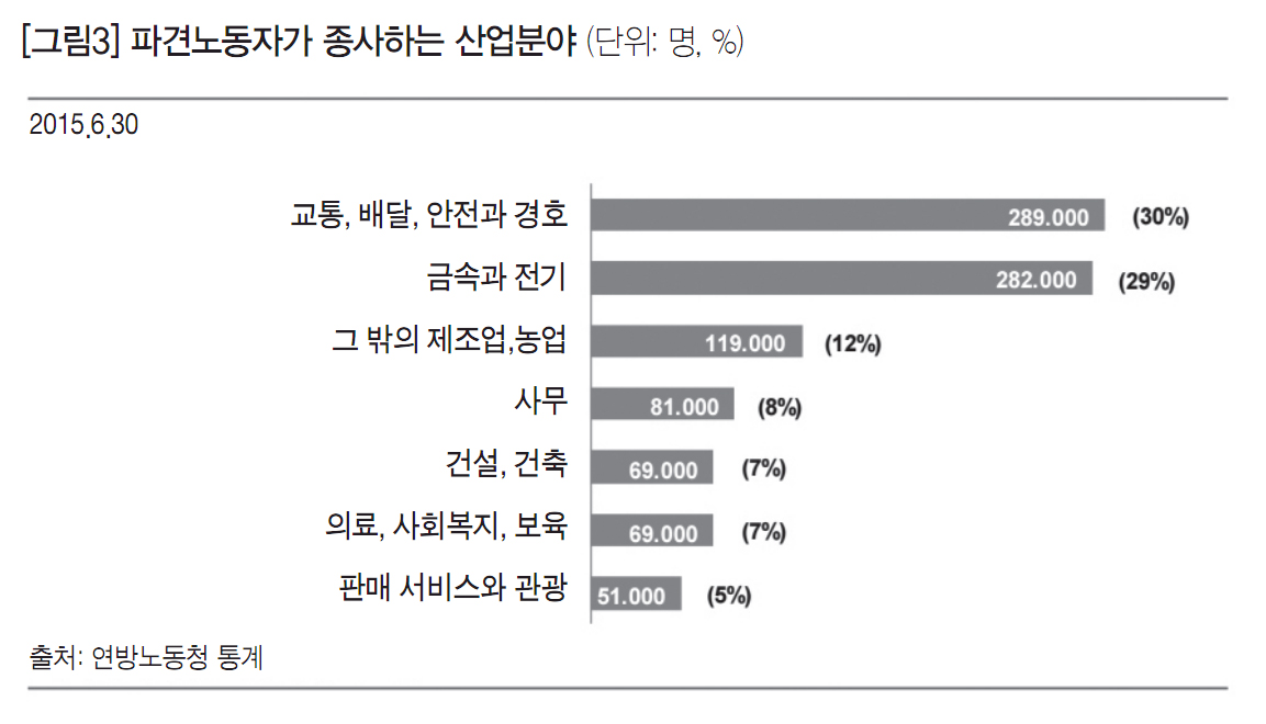 2015년 6월 기준 10명 중 3명의 파견노동자들은 교통, 배달, 안전 또는 경호 분야에서 일하고 있다. 금속과 전기 분야는 29%, 그 밖의 제조업과 농업에는 12%의 파견노동자가 종사한다. 그 외 파견노동자들이 종사하는 산업을 살펴보면 세무, 법, 관리 등 사무분야에 약 8%, 건설, 건축분야에 7%, 의료, 사회복지, 보육과 문화 분야에 7% 그리고 판매 서비스, 중개, 관광 분야에 5%가 종사하고 있다.