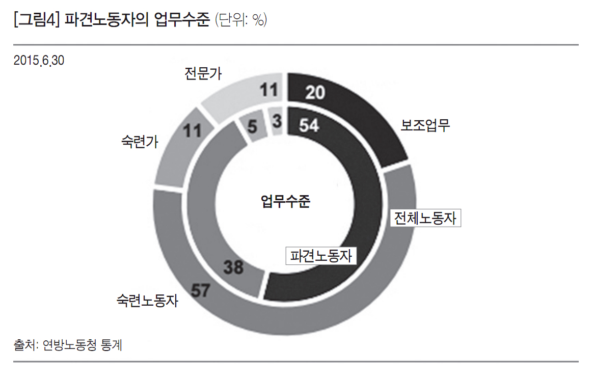파견노동자들은 대부분 낮은 수준의 업무를 하고 있다. 2015년 6월 기준 전체 파견노동자의 54%는 보조업무를 하고 있다고 밝혔다. 이는 전체 노동자 중 약 20% 정도만이 보조업무를 하는 것과 비교되는 부분이다. 반면 높은 수준의 업무를 하는 파견노동자는 전체 파견분야에서 매우 적은 편이다. 전체 노동자 중 전문가(Experten)와 숙련가(Spezialisten)는 각각 11%인데, 파견노동자 중 전문가와 숙련가인 이들의 비율은 각각 3%, 5%에 불과하다. 파견노동자 다섯 명 중 두 명이 숙련노동자(Fachkraft)로 종사하는 것에 비해 전체 노동자들 중에는 다섯 명 중 세 명이 숙련노동자로 일하고 있다. 이렇듯 파견노동은 비교적 낮은 수준의 업무를 수행하고, 실업상태나 경우에 따라 노동시장으로 진입할 기회를 잃은 사람들이 비교적 쉽게 일할 수 있는 고용형태이다.