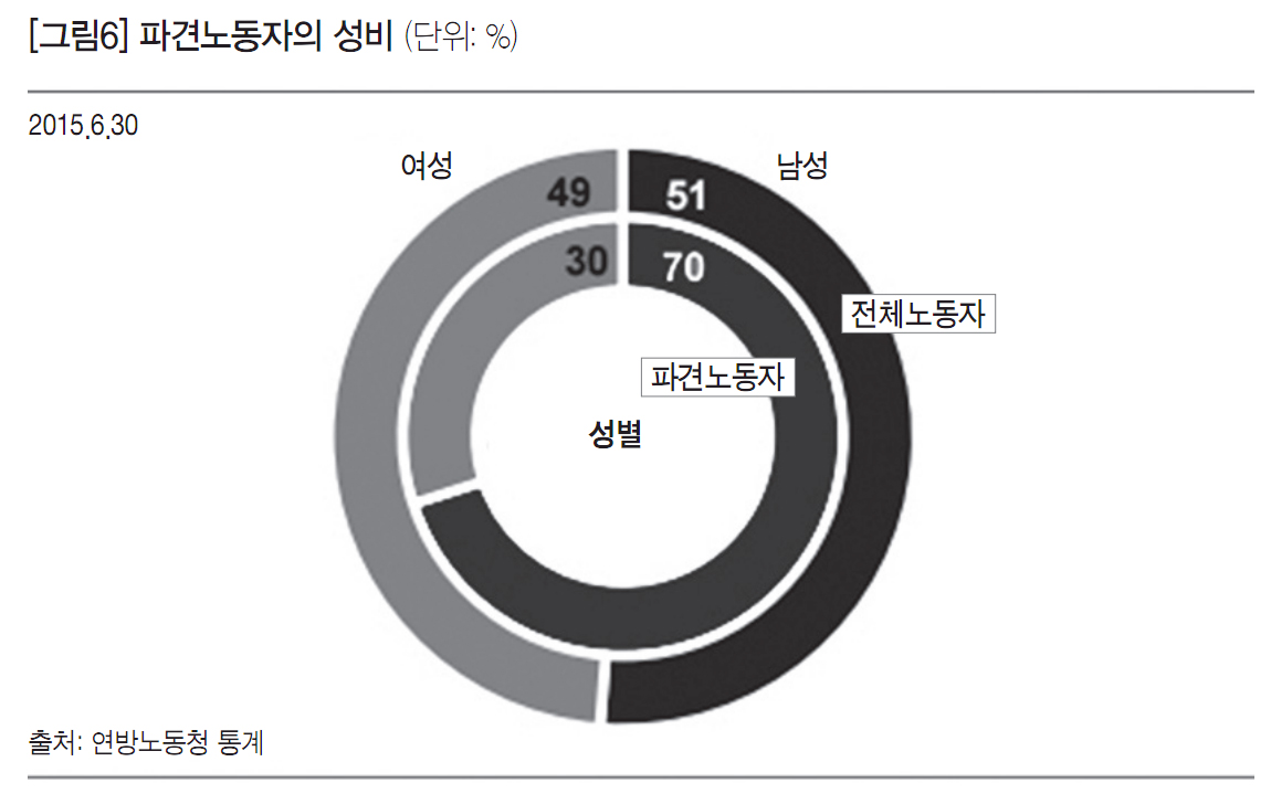 파견노동자의 성비를 보면 남성이 압도적으로 많다. 2015년 6월 기준으로 전체노동자의 남녀 성비는 비슷한 반면, 파견노동자의 70%는 남성이다. 특히 파견노동에서 남성의 비율이 높은 이유는 교통과 배달이 파견 분야에서 큰 비중을 차지하는 것과 관련이 있다.