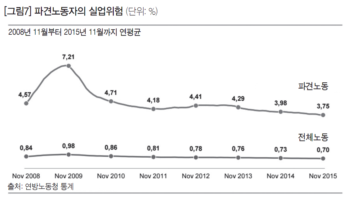 2008~09년 경제위기 당시 파견노동자 중 실업자의 숫자가 증가하고, 실업위험도 상당히 증가했다. 반면 같은 시기 전체 노동자의 실업비율에는 큰 변화가 없었다. 2011년부터는 실업위험과 관련하여 변화의 폭도 작아지고, 2009년 경제위기 당시 7%에 달하던 실업비율은 4%로 낮아졌다.