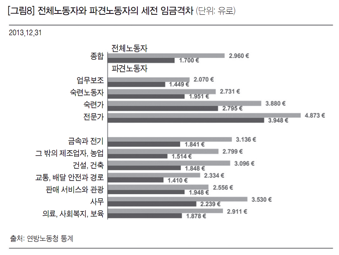 파견노동자의 세전 임금(Bruttoarbeitsentgelt)은 전체 노동자들이 받는 임금의 평균 이하인 것으로 조사됐다. 2013년 조사 결과, 정규직 노동자는 월 평균 2,960유로를 받았다. 파견노동자의 평균임금은 정규직 노동자들의 평균임금에 비해 43% 낮은 월 1,700유로였다. 통계에서 보듯 이러한 임금 격차는 다양한 파견업종에서 현저한 차이를 보인다. 앞선 조사와 함께 살펴보면 파견노동자들은 전일제로 일하지만 약 절반 정도가 보조업무에 해당하는 일을 하고 낮은 수준의 임금을 받고 있다. 각 분야에서 파견노동자로 평균 이상의 임금을 받는 전문가와 고도의 숙련노동자들은 매우 드문 것으로 나타난다. 보조업무를 하는 파견 노동자들은 모든 산업분야에서 똑같은 일을 하는 정규직 노동자들의 임금에 비해 30% 적은 1,449유로의 임금을 받는다. 전문가와 숙련된 파견노동자 역시 정규직 노동자들에 비해 30% 정도 낮은 임금을 받는 것으로 나타났다.